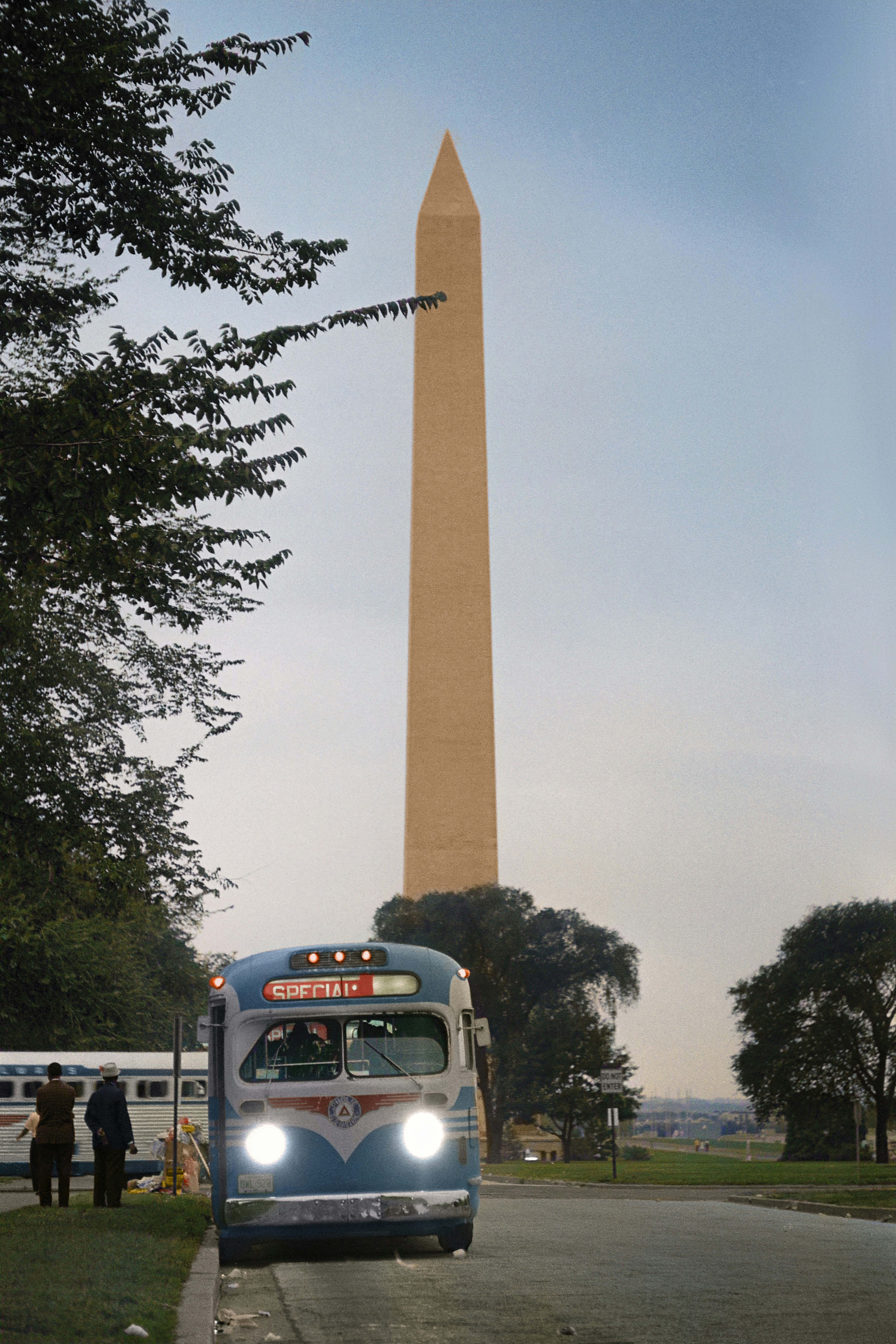 Caption reads, "[Bus leaving near the Washington Monument, after the March on Washington, 1963] / MST." Original black and white negative by Marion S. Trikosko. Taken August 28th, 1963, Washington D.C, United States (@libraryofcongress). Colorized by Jordan J. Lloyd. Library of Congress Prints and Photographs Division Washington, D.C. 20540 USA https://www.loc.gov/item/2011648313/