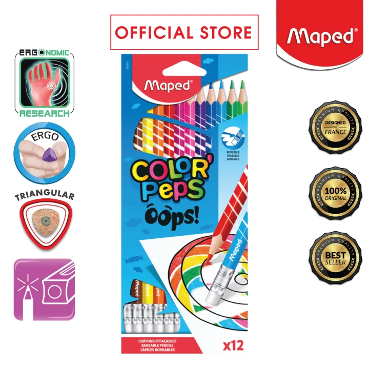 Maped Color'Peps Oops Erasable Color Pencils x12 with Break Resistant Leads, Triangular Shaped for Anti Roll-off